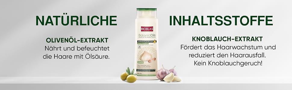 - Hair care: more effective care thanks to the herbal formula with real garlic extract. Thanks to the special formula with real garlic extract, BIOBLAS BotanicOils garlic shampoo not only prevents hair loss, but corrects the natural fat content of the hair, builds it up and gives it new shine and suppleness
