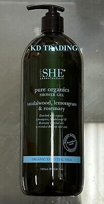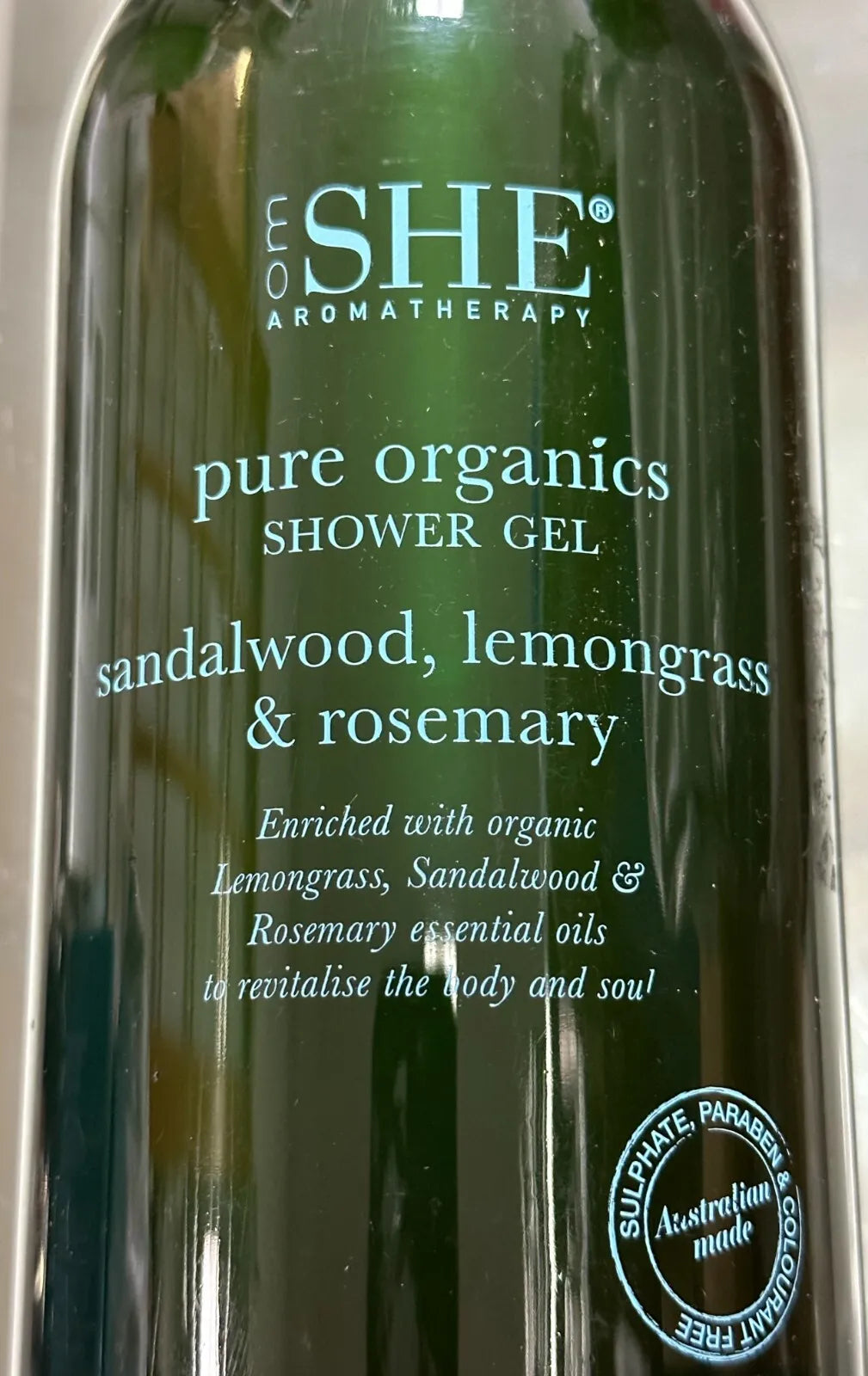 om SHE's Pure Organics Shower Gel is enriched with organic Rosehip, Aloe Vera, Chamomile and Calendula Oils to gently cleanse, soothe and hydrate the skin without the use of harsh chemicals. Our delicious blend of organic Sandalwood, Lemongrass & Rosemary essential oils revitalises the body and soul