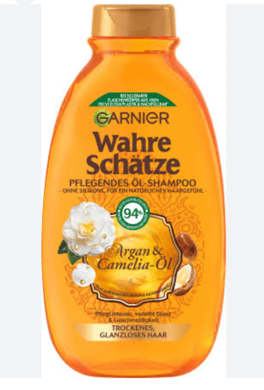 Garnier Wahre Schätze Nourishing Shampoo Argan & Camelia Oil combines the fantastic power of two mystical oils to provide intensive care without weighing hair down. The formula nourishes and pampers dry, dull hair from roots to ends. As a result, the hair immediately appears transformed, easier to comb and shines full of natural beauty.
