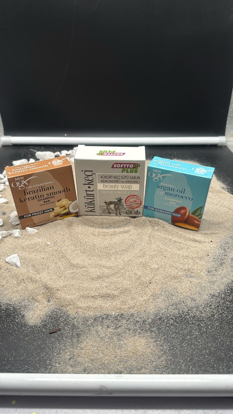 New Ogx Brazilian Keratin tester shampoo for freezy hair 80ml + ,Softto Plus sulfur.goat beauty soap 100gr+New Ogx argan oil of Morocco tester shampoo for damaged hair 80ml