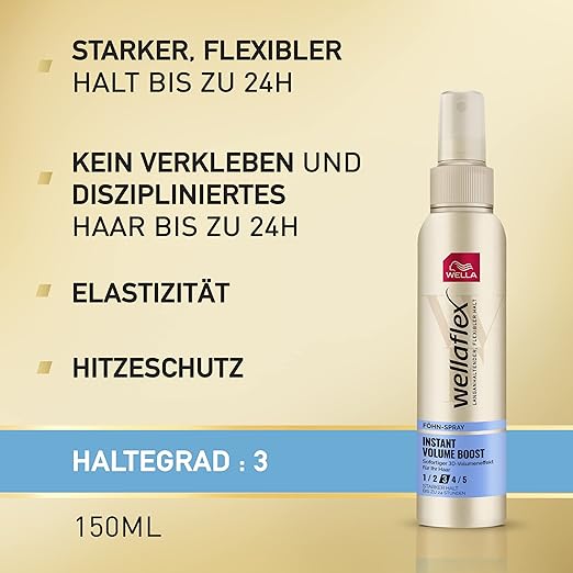 Wella flex Instant Volume Boost Strong Hold Hair Dryer Spray - Heat Protection Spray for 24 Hours Flexible Hold without Sticking - with UV Protection and Hair Taming Complex with Macadamia Oil - 150 ml